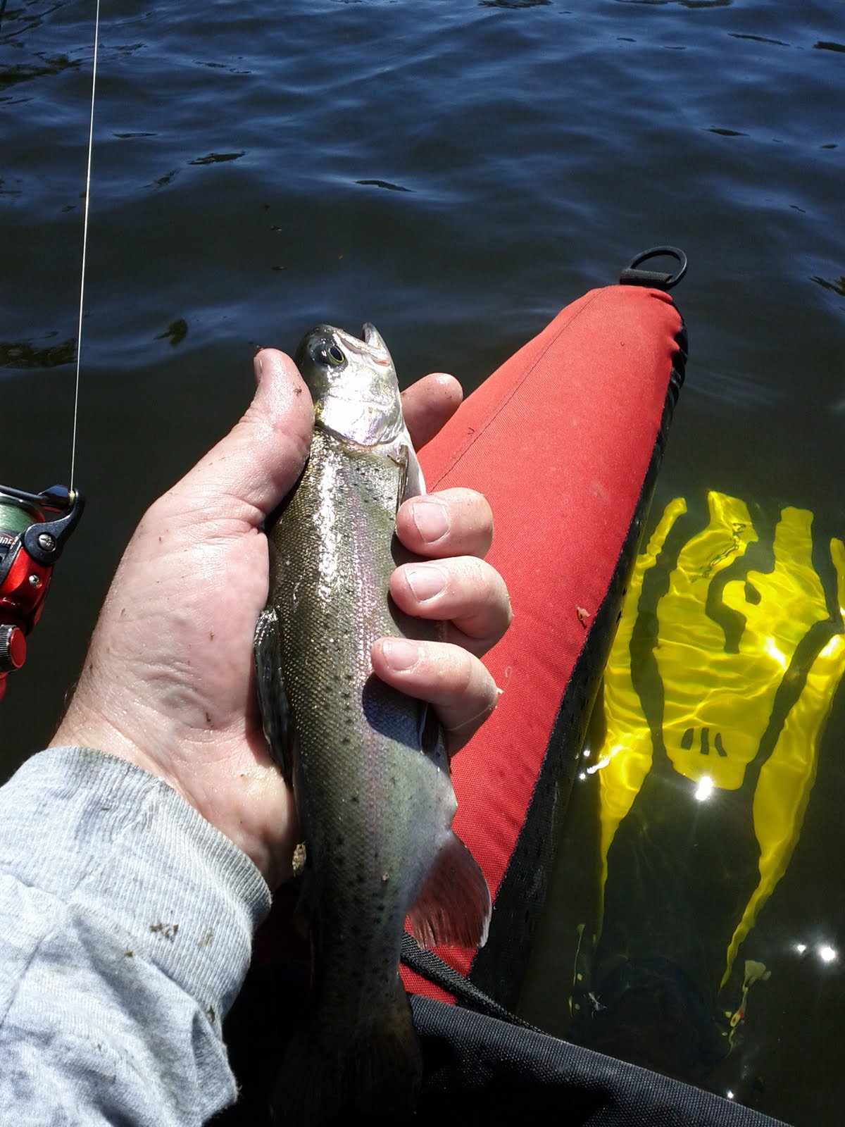 We got things set back up to float and fish at the head of Tail Lake. As we set things up Jason saw a few fish in the shallows near us. Albino, rainbow, brooke and tiger trout were present. Was kind of cool to see each type close to where we were at. It got the 'hopeful expectations' flowing as well as getting Jason distracted playing with them vs getting out in the tube and looking for fish of better size. These had been maybe 8 or so inches long. Well we got moving and pretty soon started to get into some fish.